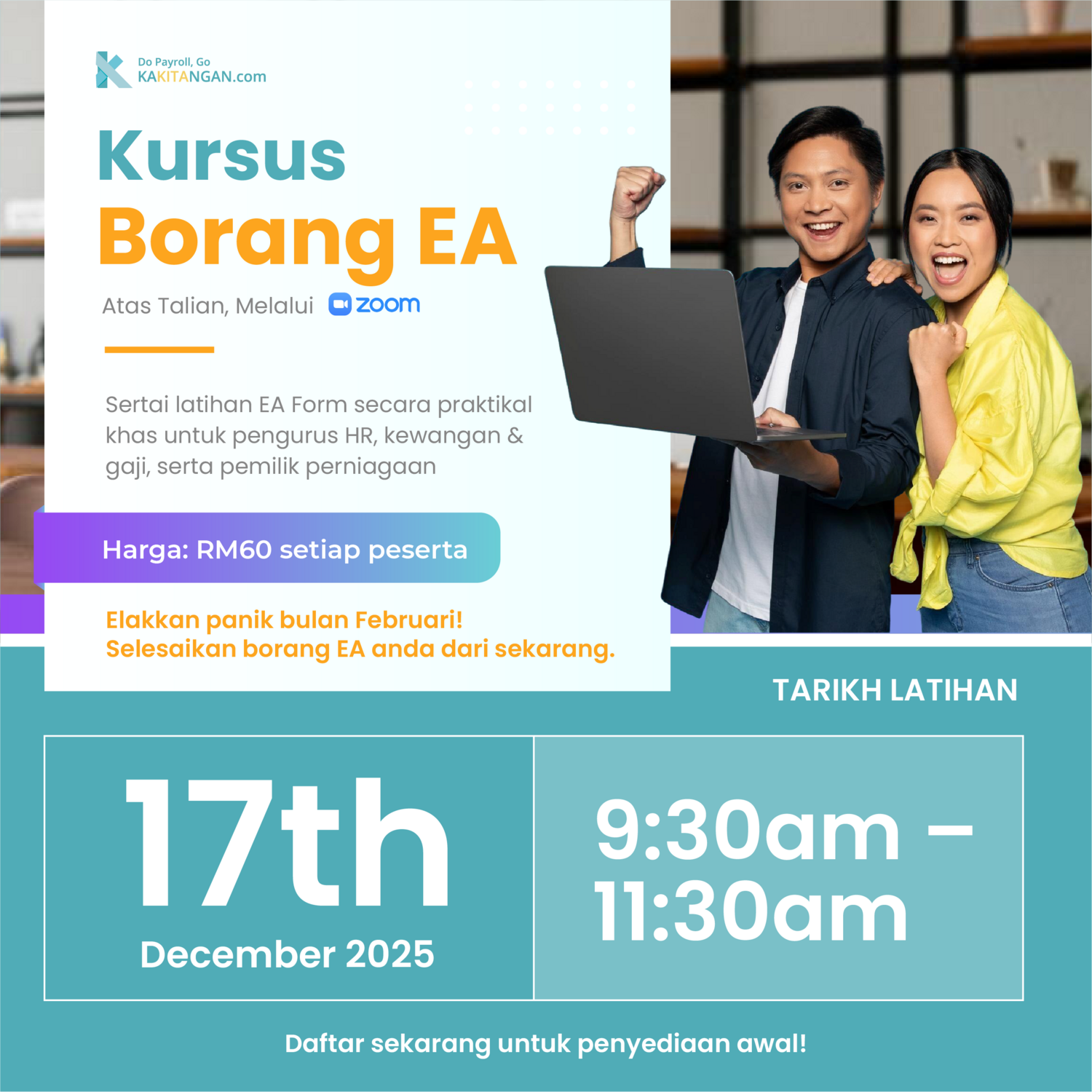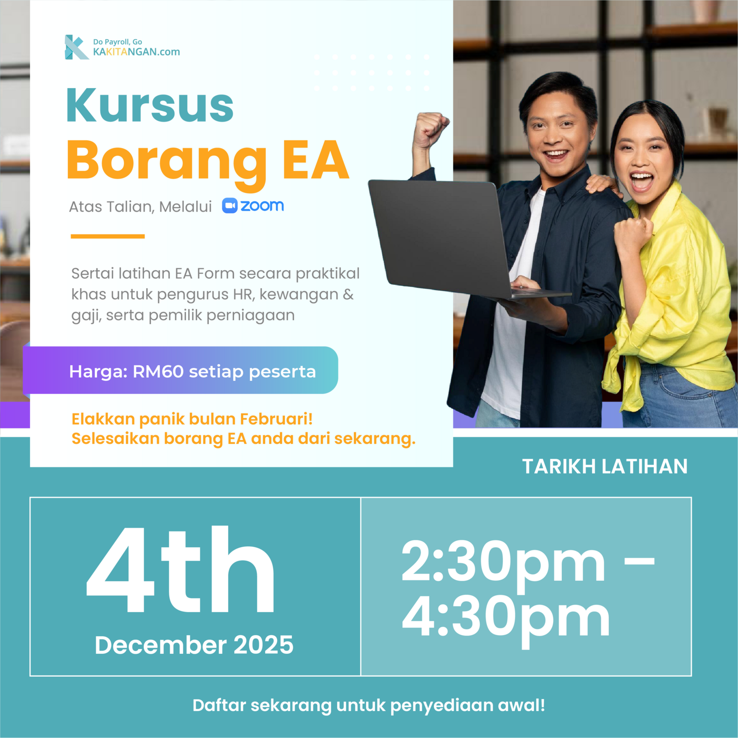 Sesi yang ringkas, fokus dan dijalankan secara dalam talian melalui Zoom — sesuai untuk pengurus HR, kewangan, gaji dan pemilik perniagaan.