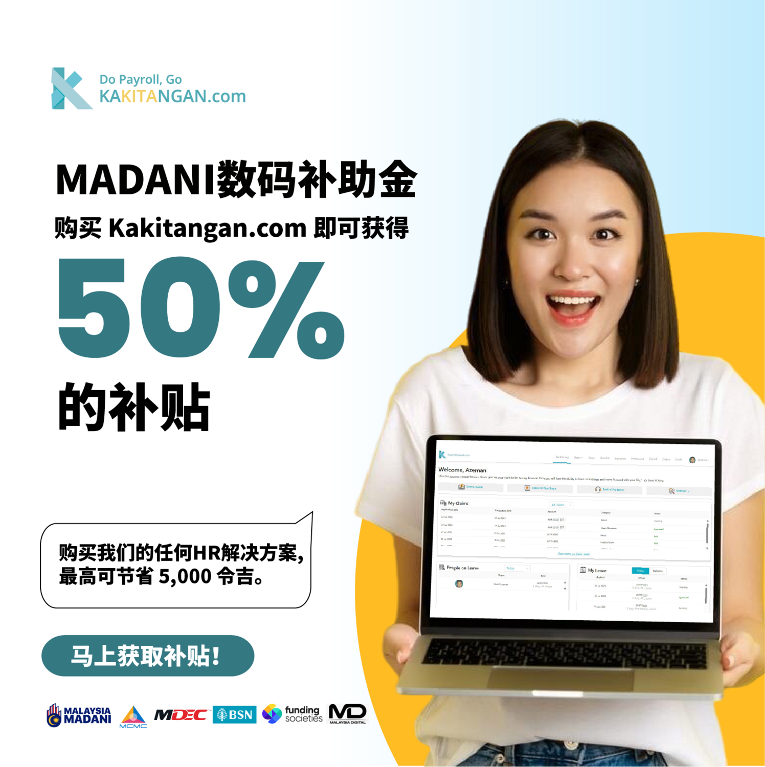 马来西亚政府提供高达 RM5,000 的配对补助金,以协助中小企业采用数码解决方案。作为此计划下的官方认证数字合作伙伴,Kakitangan.com 可协助您在订阅我们的人力资源与薪资服务时申请该项补助金。