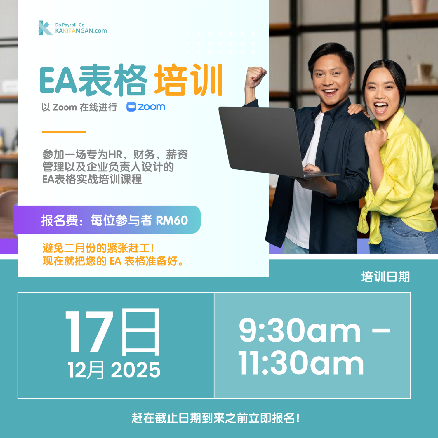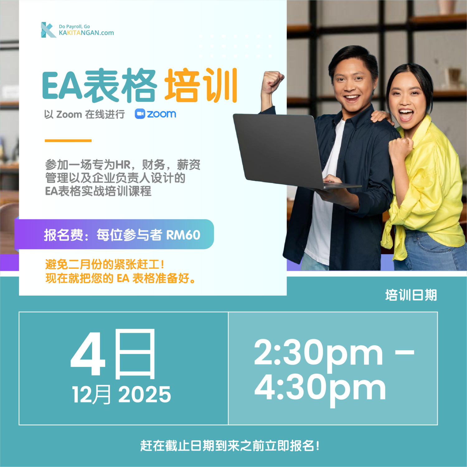 讲师将讲解最新的 LHDN 要求、截止日期以及常见错误点。你将获得实用技巧,确保公司按时并符合规定地提交 EA 表格,避免因疏忽而造成不必要的成本。